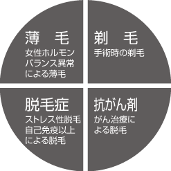 - ホルモンバランス異状による薄毛は、男性の薄毛同様に髪が徐々に産毛化し進行した場合、急激には回復しない症状となります。2.と同様に女性として求める外見を維持する為にウィッグは必須アイテムとなります。